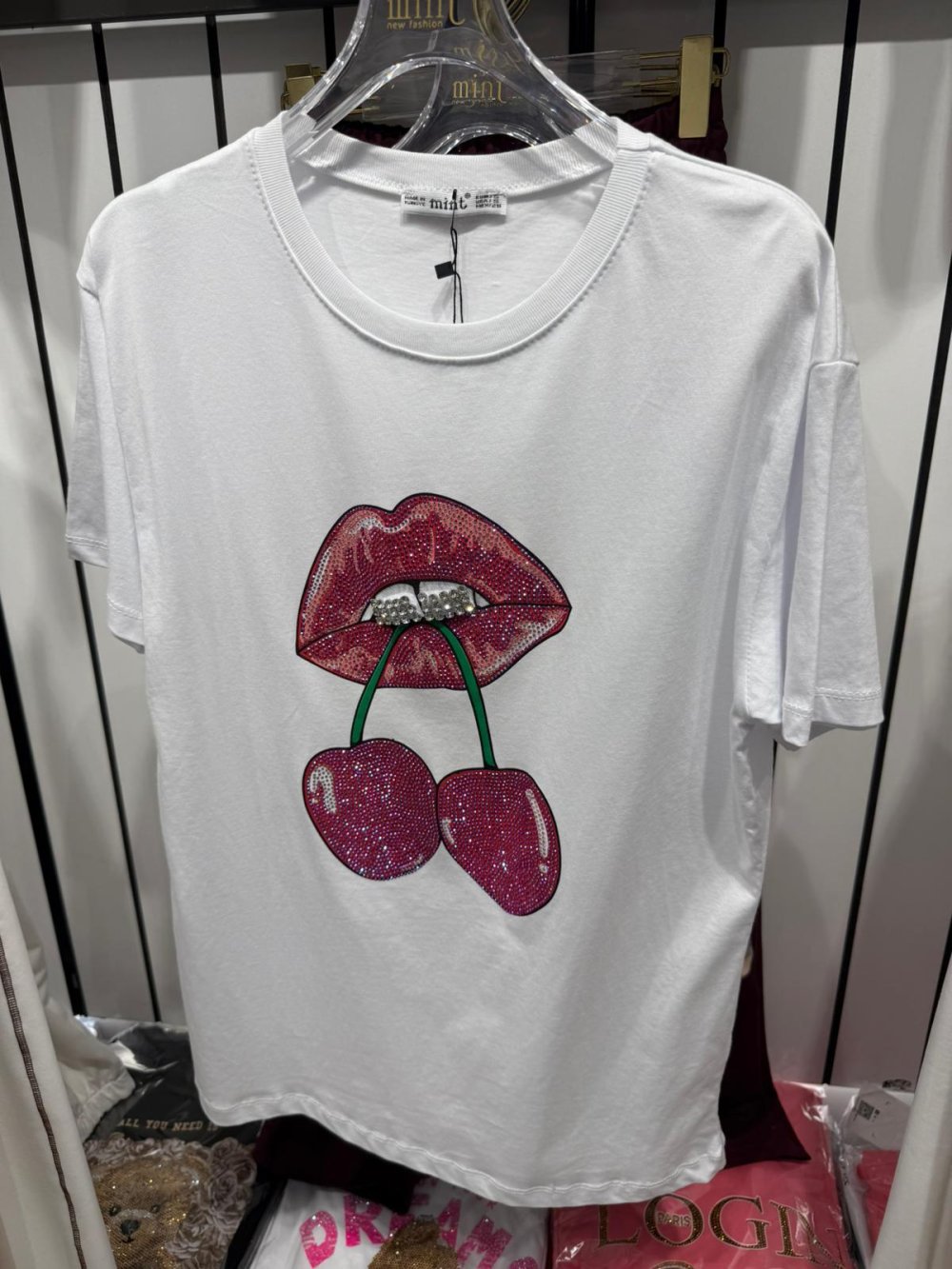 Bayan Kiraz Dudaklı Tişört Beyaz