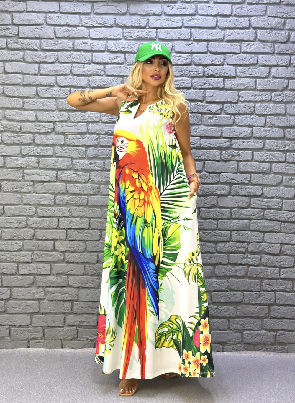 BAYAN PAPAĞAN BASKILI ELBİSE Beyaz