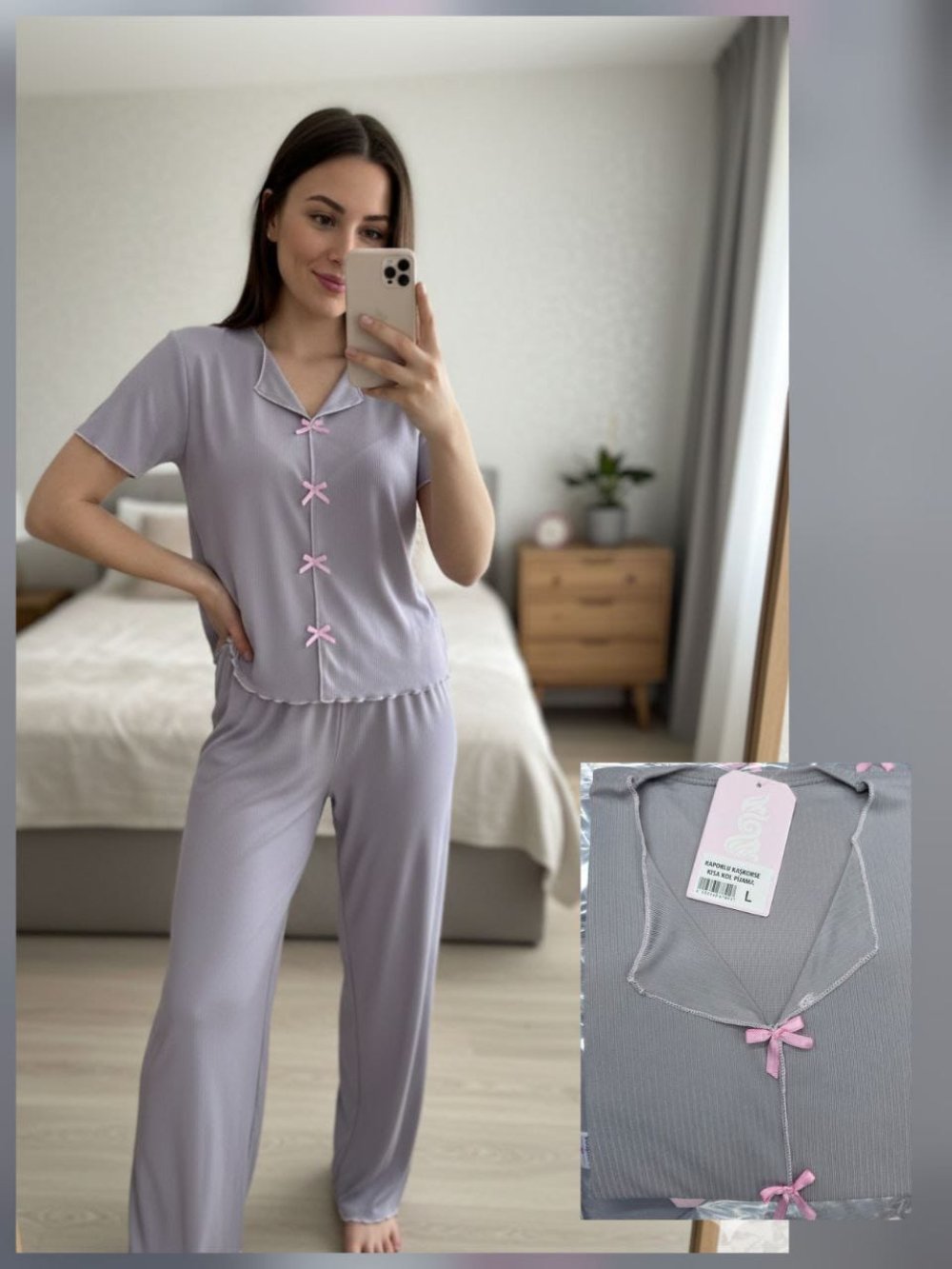 PEMBE FİYONK DETAY PİJAMA TAKIMI Gri