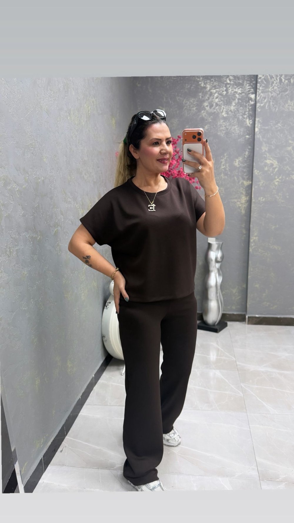 YUVARLAK YAKA MODAL KUMAŞ İKİLİ TAKIM Acı Kahve